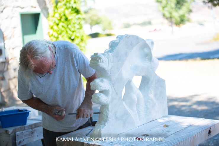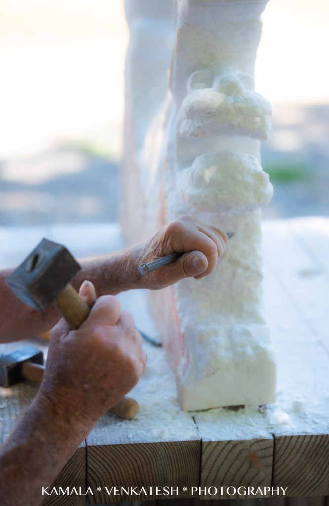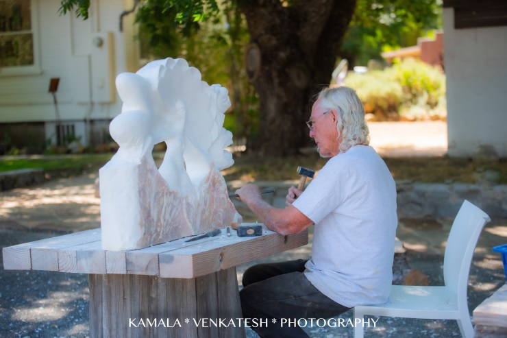 | Ted at work one afternoon of August, 2023, working on his most recent piece-a big block of marble imported from Italy. Watching him at work was just fascinating. Such control in every stroke he used and the placement of the delicate chisel. I could see that he required complete attention to what he was doing. One wrong move, and the whole piece would have fallen apart. Such precision and concentration. I felt like I was invading his space to photograph him while he worked. But he was oblivious to me, I think. Ted tells me that he has completed this piece and I can’t wait to see it. It has perhaps taken him almost eight weeks or longer of long hours of work each day. |