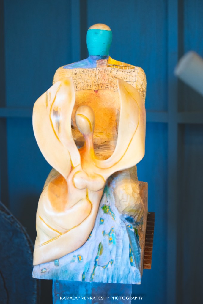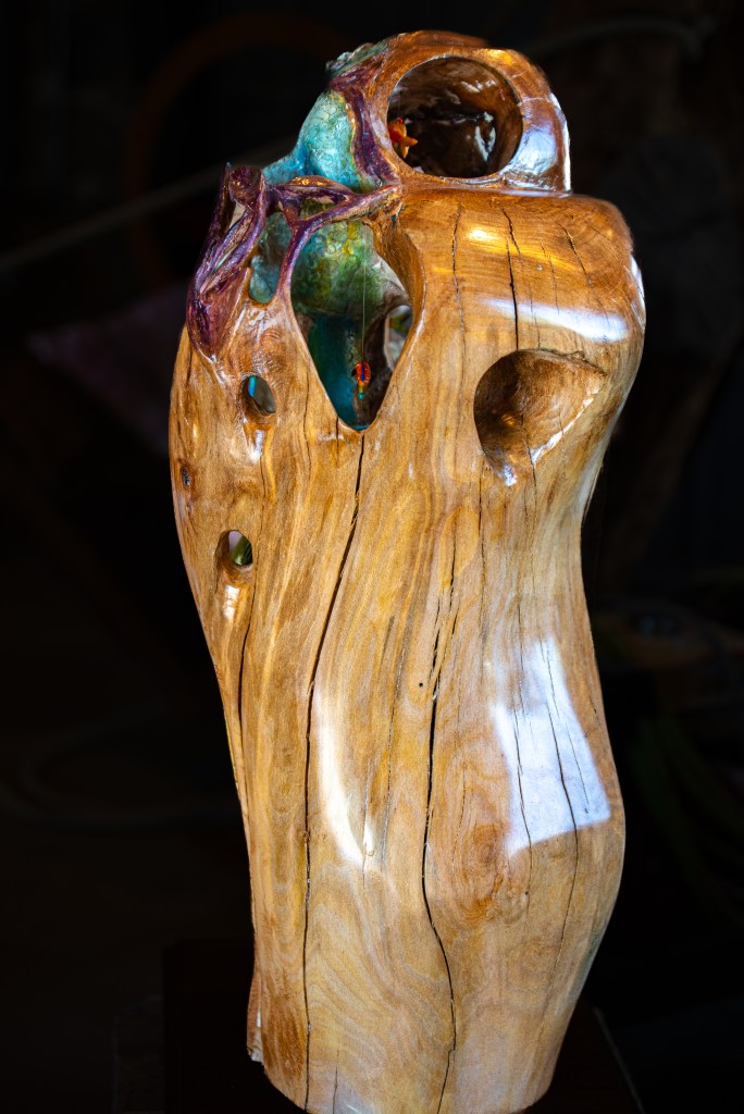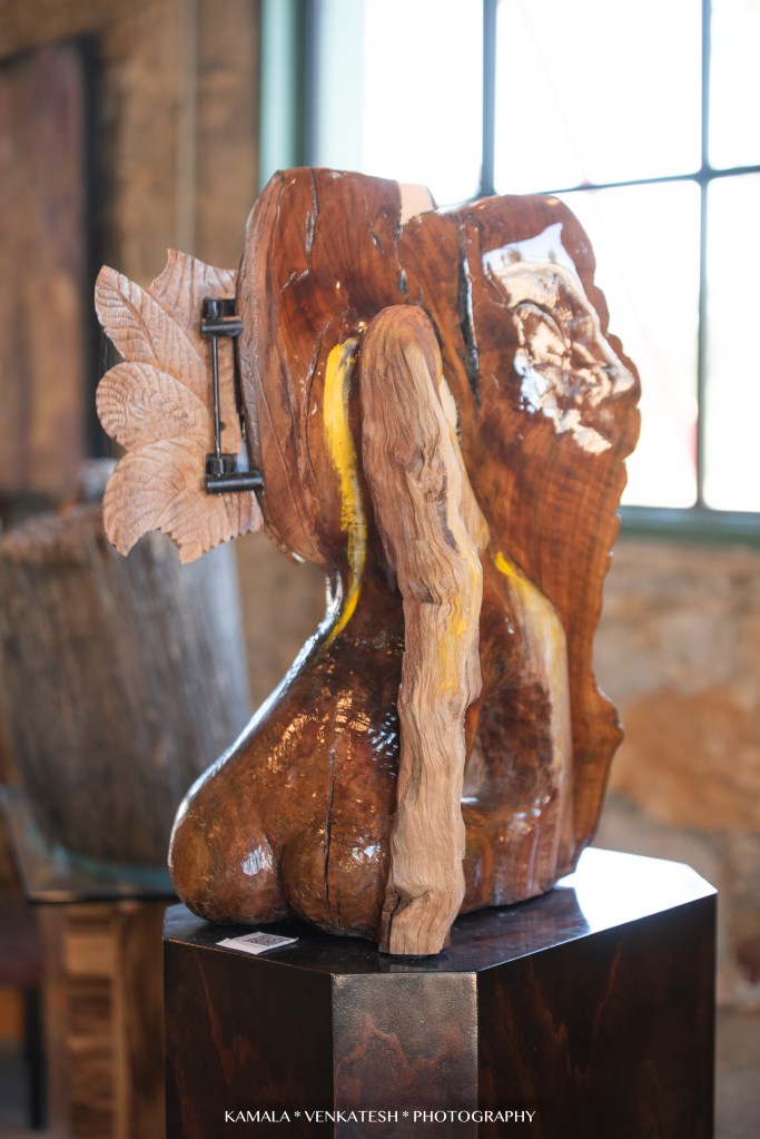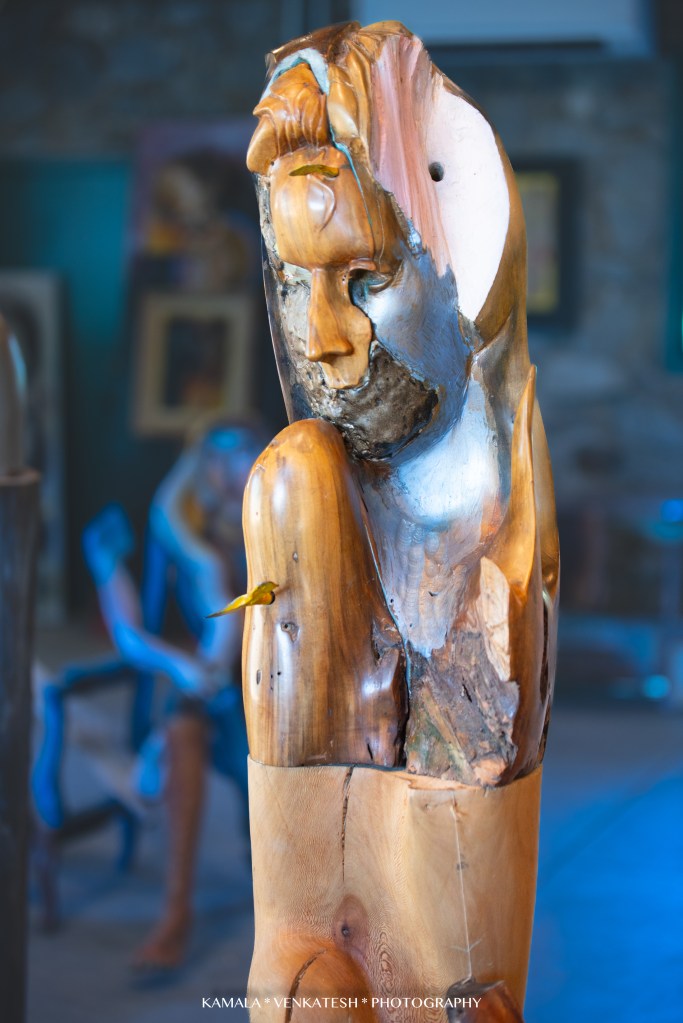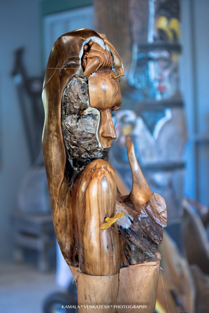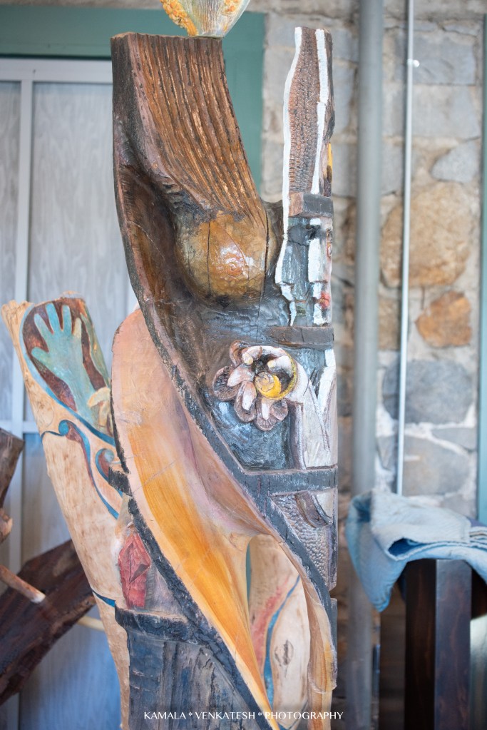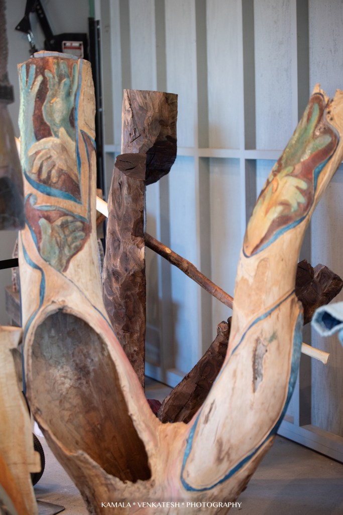 I was most fascinated with a few of Ted’s pieces I saw…one that has “moving” parts to it and is put together like a jig-saw puzzle. Each piece of the large sculpture is a work of art in itself. He encourages his visitors to touch and interact with them-remove the pieces held together by wood dowels chiseled to resemble large screws. Such a unique concept and so clever! In my opinion, it is the center piece of his gallery and I hear that it has great sentimental value to him.